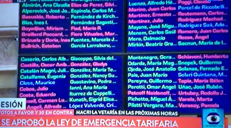 Con 37 votos a favor y 30 votos en contra, el Senado aprobó la Ley Antitarifazo. La sesión duró aproximadamente 13 horas y estuvo signada por cruces durísimos. El presidente Mauricio Macri adelantó que vetaría la ley. Así pareció confirmarlo el jefe del bloque de senadores de Cambiemos, el radical formoseño Luis Naidenoff, quien cerró el debate.