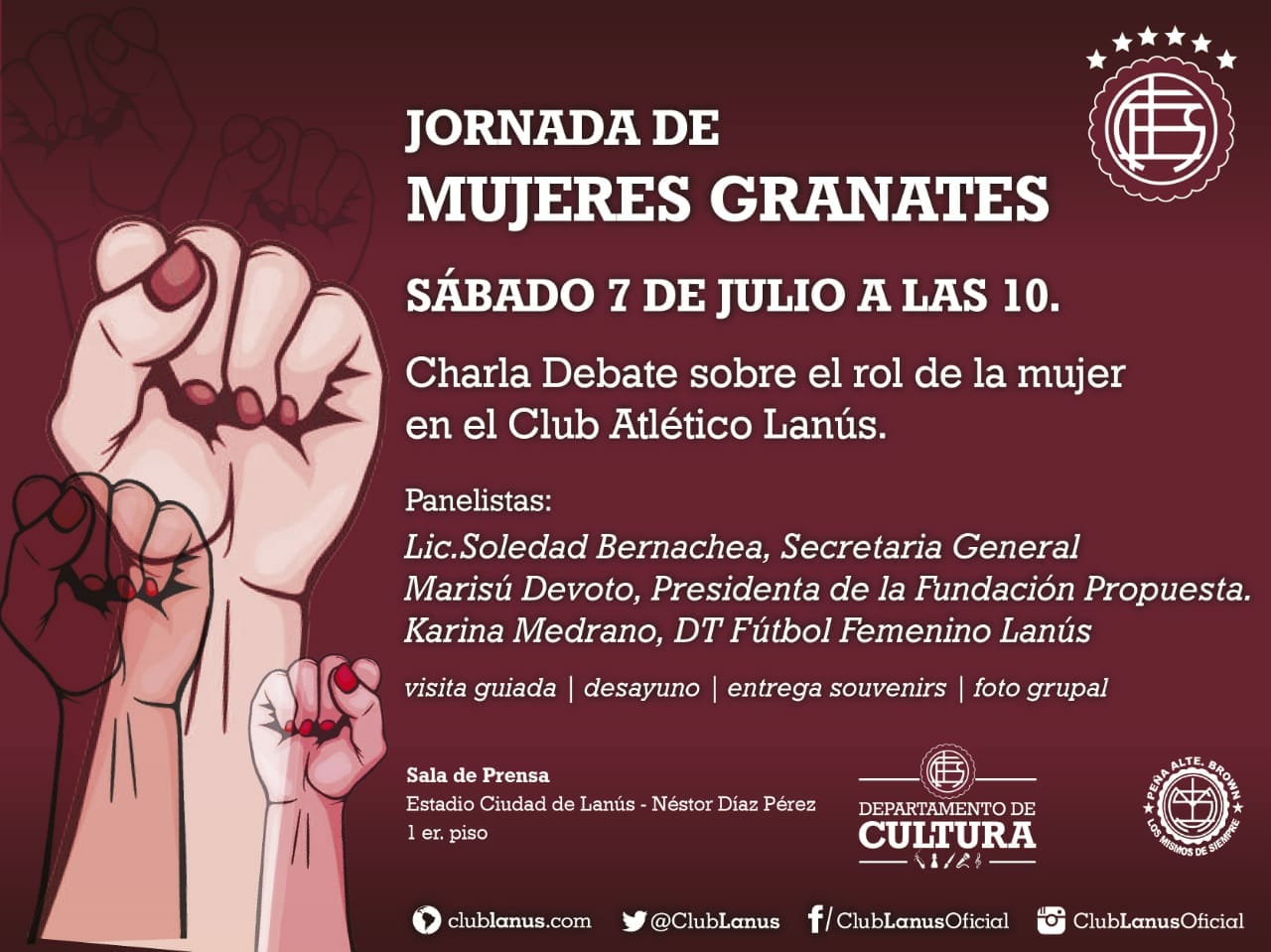 La entidad deportiva de la ciudad brindará una charla debate abierta sobre el rol de la mujer en el club. Expondrán la secretaria general, Soledad Bernachea; la Presidenta de la Fundación Propuesta, Marisú Devoto; y la entrenadora del primer equipo de fútbol femenino del Granate, Karina Medrano.