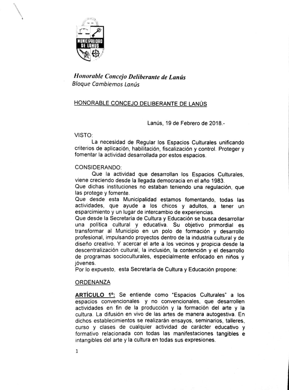 La jornada se desarolló en la mañana de hoy, en el Concejo Deliberante de Lanús, donde la nueva ordenanza municipal, relacionada con la regulación de los centros culturales, se aprobó por 24 votos, es decir, la totalidad del recinto. Este proyecto, que en principio había sido presentado por el oficialismo, contó con una serie de modificaciones de la oposición (Unidad Ciudadana), que atendieron a los reclamos y necesidades impulsados por los más de veinte espacios que conforman el Frente Cultural de Lanús. Entre ellos, considerar que los permisos para los centros culturales no tengan las mismas exigencias que un comercio, y otorgarles legitimidad para el desarrollo de sus actividades.