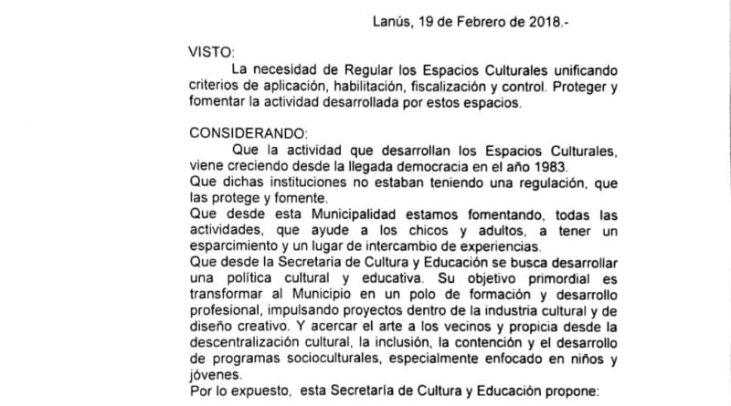 Esta resolución favorable para la cultura local llegó días después de la clausura del centro cultural «El Barrio Cultural» de Remedios de Escalada, cuando el 16 de julio ingresó  al lugar un inspector municipal acompañado por diez policías armados. Aquel suceso se había generado en el pleno marco de la negociación de la flamante ordenanza, por lo cual el Frente Cultural del distrito se organizó y le exigió respuestas al intendente, al entender este atropello como una contradicción a lo que se venía conversando por otro lado.