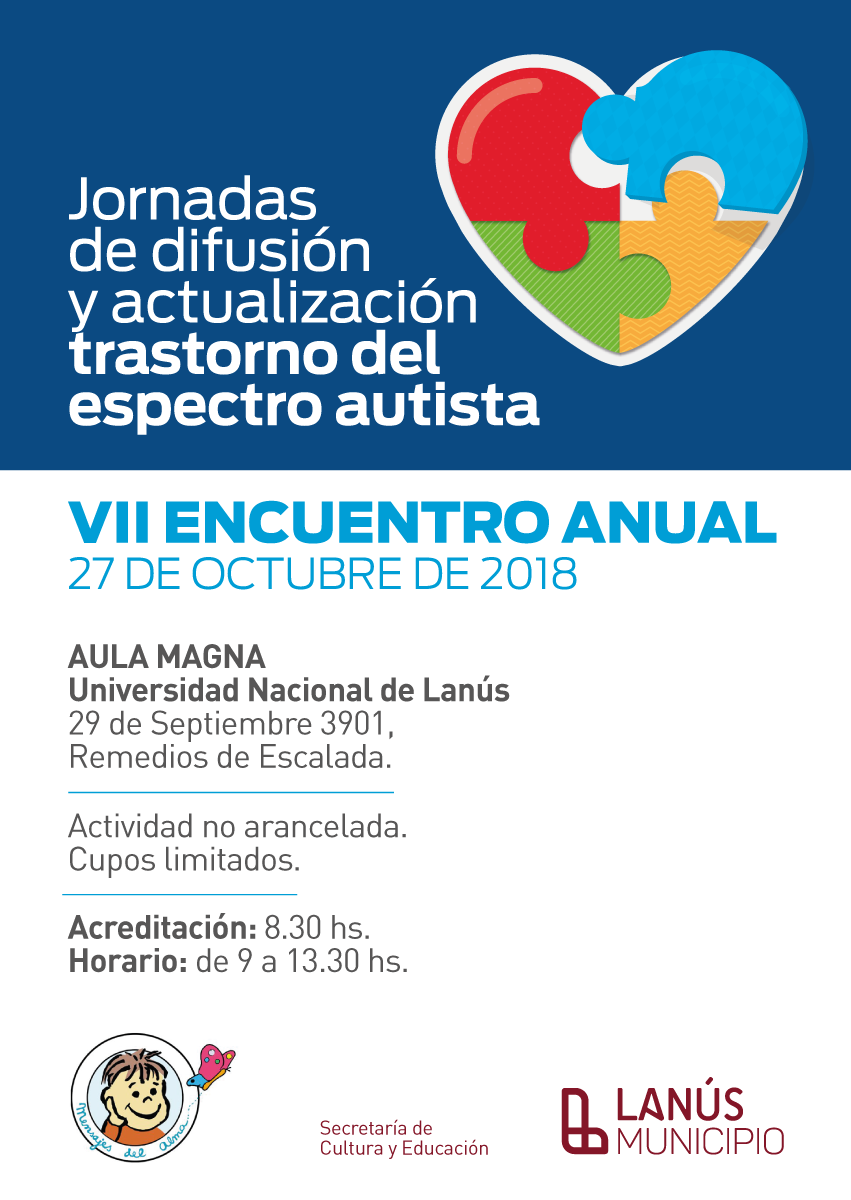 El municipio de Lanús, junto con la Fundación Mensajes del Alma, llevarán a cabo el VII Encuentro Anual de las Jornadas de Difusión y Actualización sobre el Trstorno del Espectro Autista, el sábado 27 de octubre. La jornada se desarrollará de 8:30 a 13:30, con entrada libre y gratuita, en el aula magna de la Universidad Nacional de Lanús, ubicada en 29 de septiembre 3901, Remedios de Escalada.