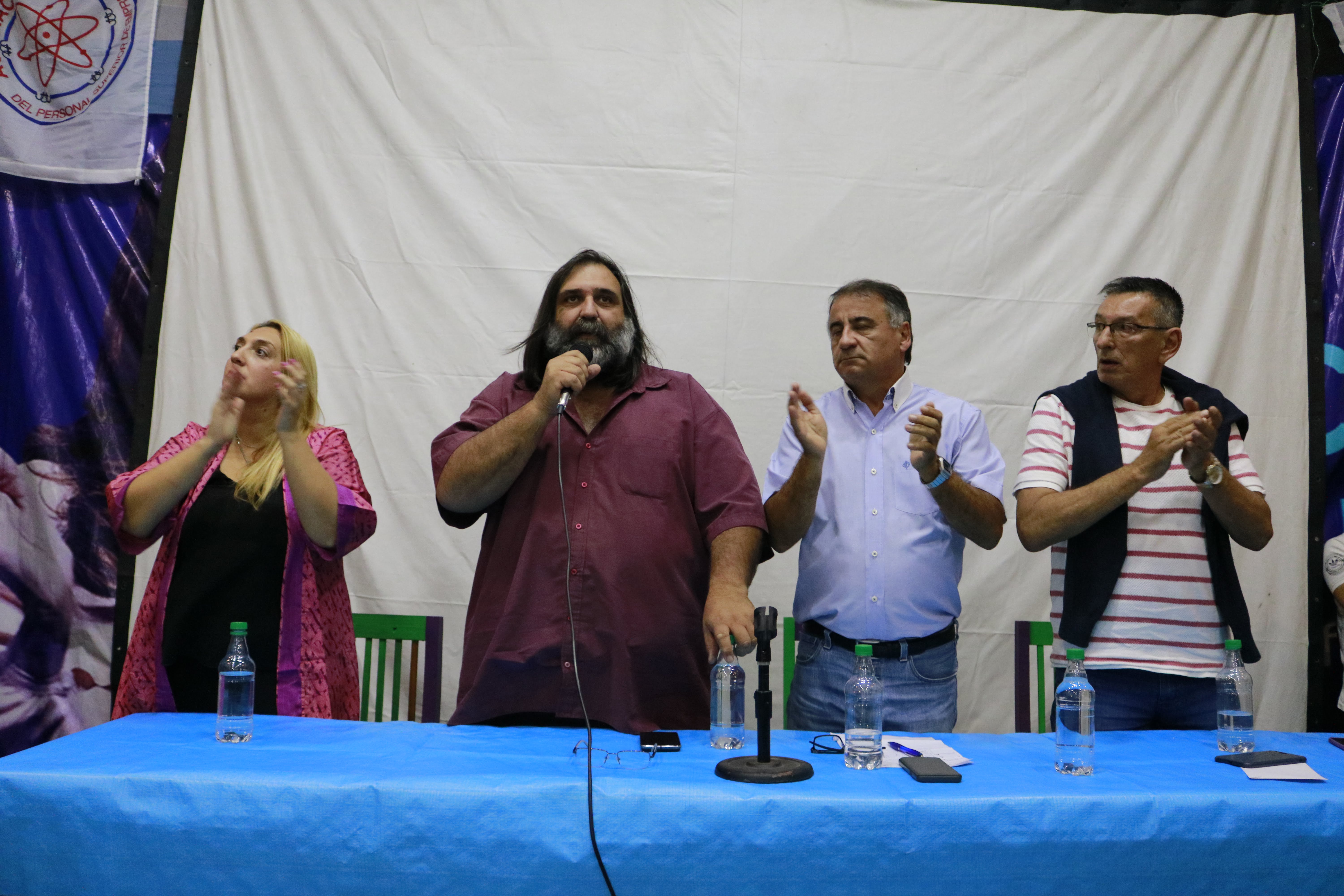 La mesa de oradores estuvo integrada por Marcela Barbeiros (UPCN), Héctor Villagra (CGT Regional), Roberto Baradel (SUTEBA) y el anfitrión del espacio, Edgardo Depetri (Unidad Ciudadana).
