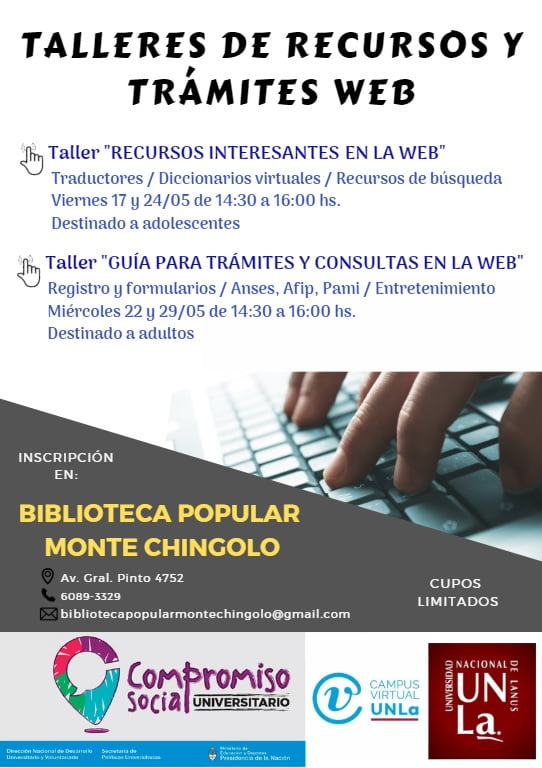 La Universidad Nacional de Lanús (UNLa) brindará talleres gratuitos y abiertos a la comunidad en la Biblioteca Popular Monte Chingolo sobre recursos para estudio e investigación en Internet, además de guía para trámites digitales y consultas a organismos públicos a través de la web.