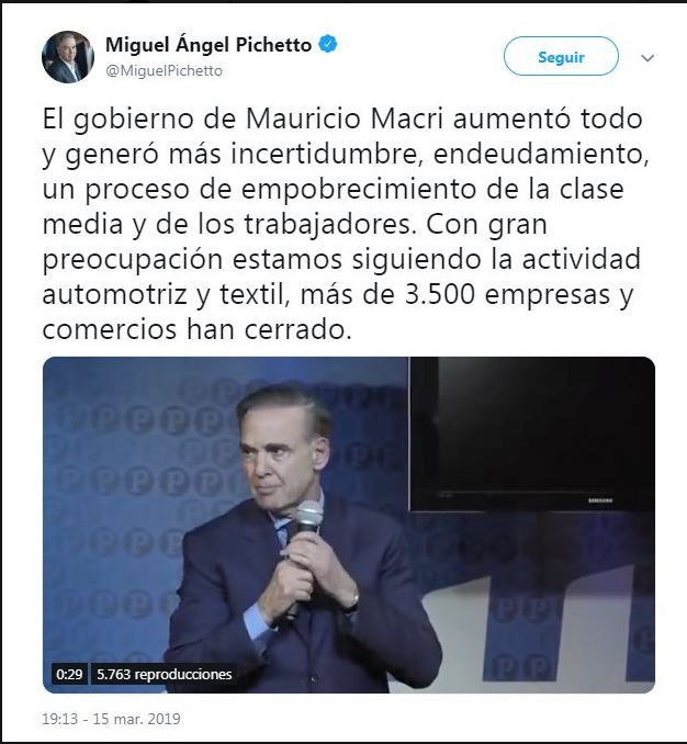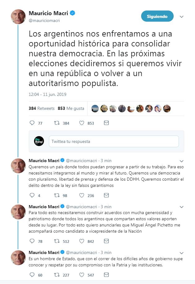 El senador nacional por el PJ (Río Negro), Miguel Ángel Pichetto, será el candidato a vicepresidente de Mauricio Macri. Pichetto había dado señales ayer, cuando le dijo a la periodista María O’ Donnell que en un ballotage votaría por Macri. Ahora fue más allá: compartirá con él la fórmula. El propio presidente la anunció en su cuenta de Twitter, con términos que en otra época hubieran avergonzado a un dirigente dizque peronista. » En las próximas elecciones decidiremos si queremos vivir en una república o volver a un autoritarismo populista», dijo Macri, refiriéndose a los gobiernos de Néstor y Cristina Kirchner, que Pichetto apoyó desde la conducción del bloque de senadores durante 12 años.
