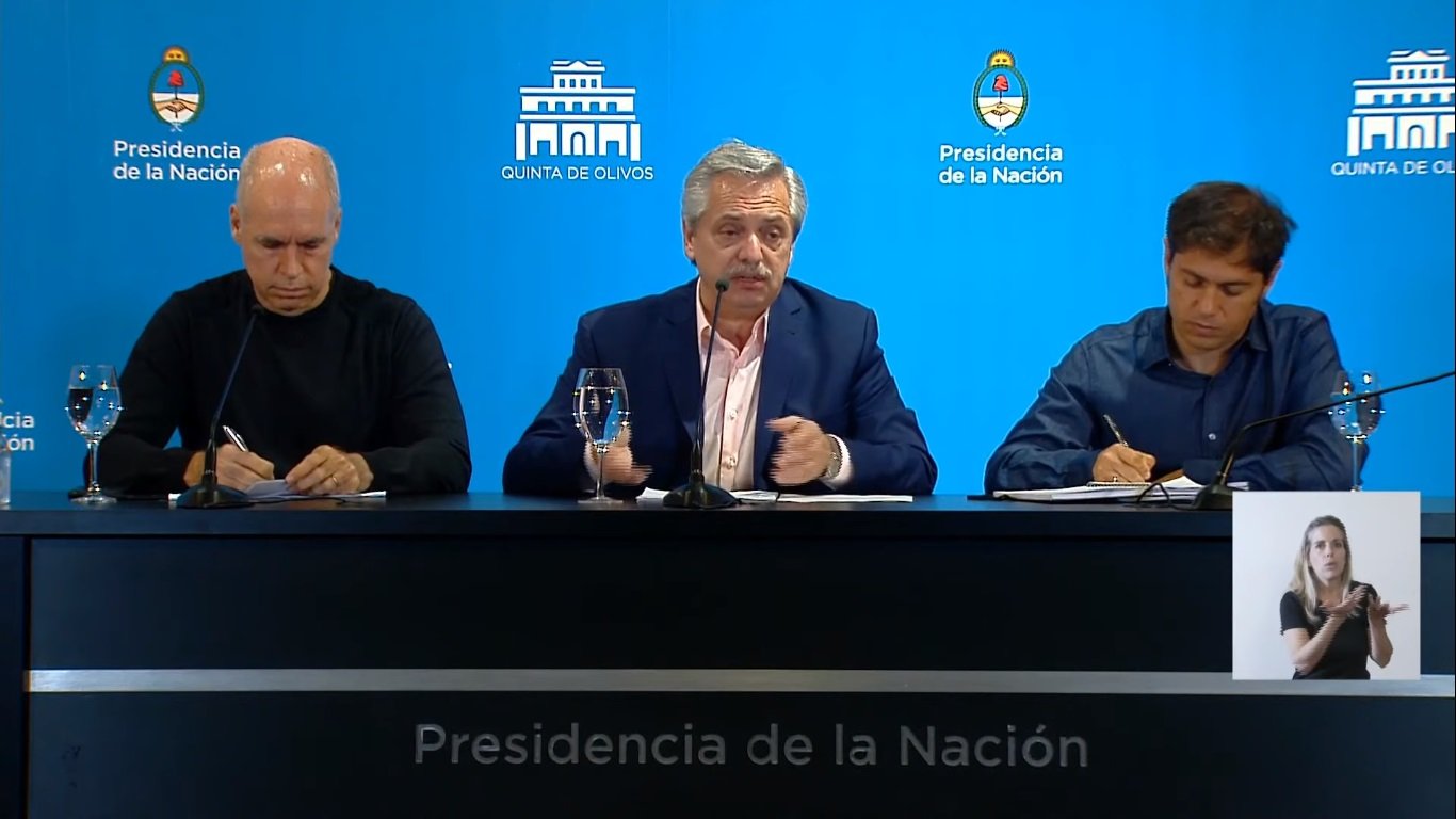 «El modo más solidario es cuidarnos a nosotros para cuidar a los otros. Las medidas tomadas no suponen un agravamiento, simplemente pienso que si atacamos el problema de chiquito vamos a impedir que crezca», comentó Fernández, en compañía del gobernador de la Provincia de Buenos Aires, Axel Kicillof, y el jefe de gobierno porteño, Horacio Rodríguez Larreta.