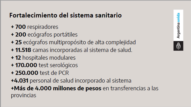 Fernández explicó que desde que se inició la cuarentena se incoporaron 11 mil camas, 12 hospitales y 700 respiradores al sistema de salud para atender la emergencia.