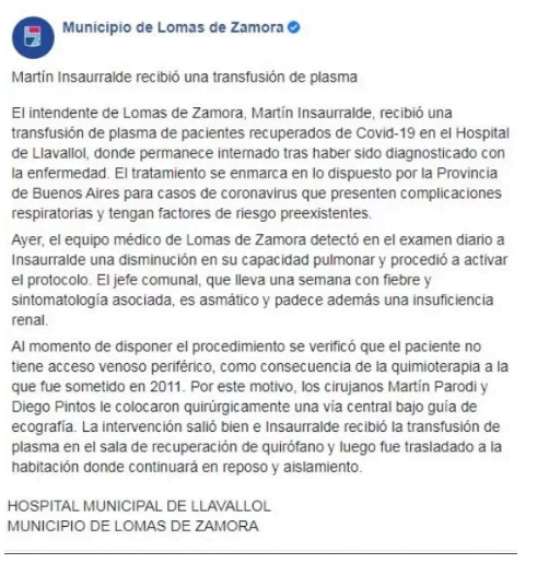 PolíticaÚltimas Martín Insaurralde recibió una transfusión de plasma: continuará en reposo y en aislamiento 18 junio, 2020 direccion El intendente de Lomas de Zamora, Martín Insaurralde, recibió una transfusión de plasma de pacientes recuperados de coronavirus en el Hospital Llavallol. Adjuntamos a continuación el correspondiente parte médico. Share on: WhatsApp