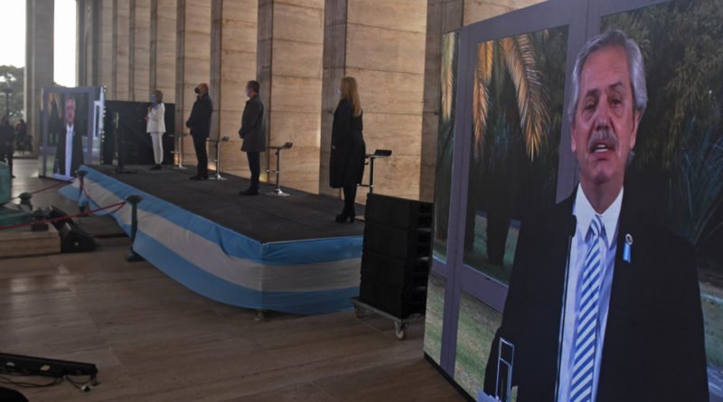 La conmemoración central se realizó en el Monumento Nacional a la Bandera de la ciudad de Rosario, en tanto que el mandatario la presidió, en forma virtual, desde la residencia de Olivos, junto a integrantes del Gabinete nacional y la Primera Dama, Fabiola Yáñez.