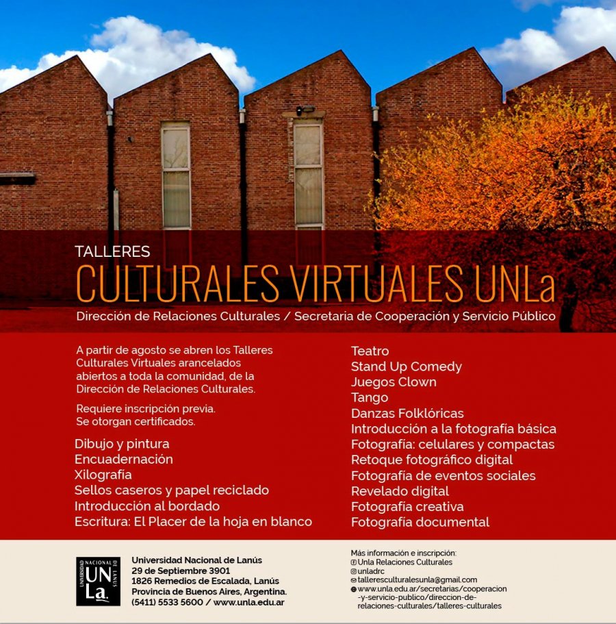 A partir del aislamiento social, preventivo y obligatorio provocado por la pandemia de Covid-19, que impidió las clases presenciales, la Universidad Nacional de Lanús (UNLa) decidió relanzar sus talleres culturales en modalidad virtual para que los interesados puedan participar desde sus hogares. De esta manera, ya abrió la inscripción a 17 propuestas muy variadas que se dictarán a partir del mes de agosto.