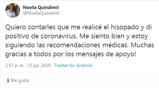 La Secretaria de Desarrollo Social del Municipio de Lanús, Noelia Quindimil, dio positivo de coronavirus. La noticia fue confirmada por la propia funcionaria, que “se encuentra aislada en buen estado de salud y asintómatica”, de acuerdo al comunicado local emitido hace instantes.