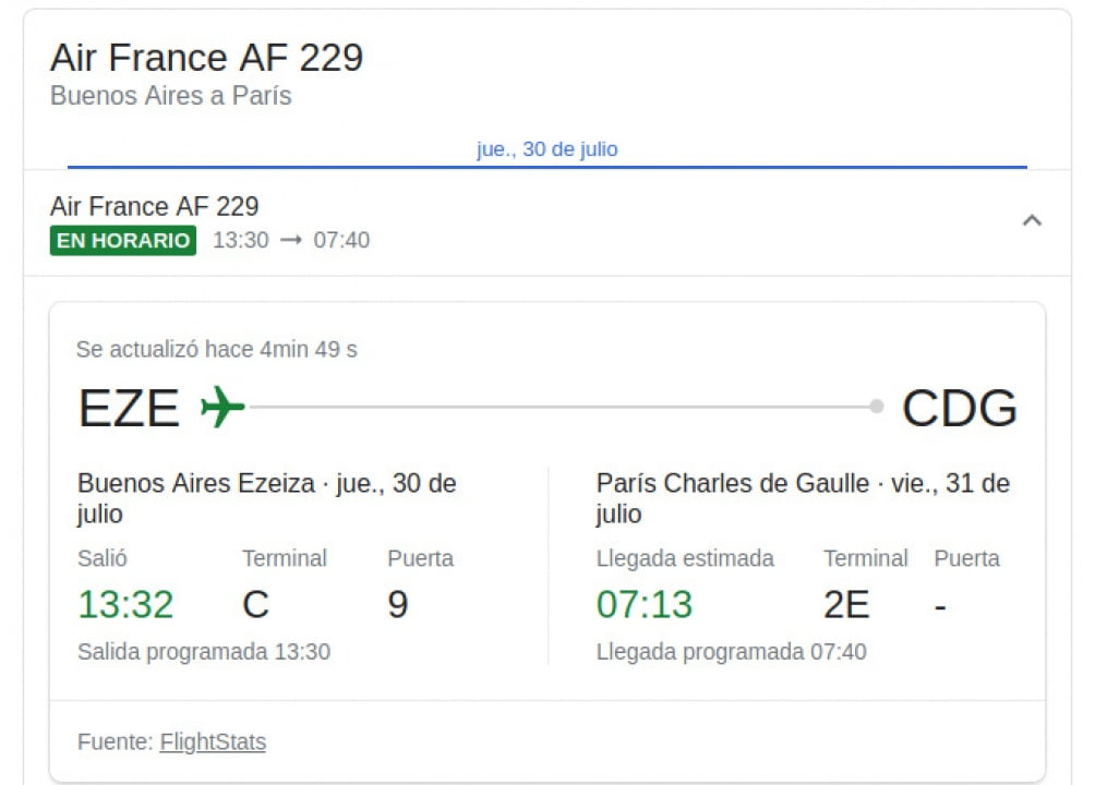 Según confirmaron a Télam fuentes aeroportuarias, Macri abordó hoy el vuelo AF229 de la compañía Air France, que partió desde el aeropuerto internacional de Ezeiza a las 13.30 y que tiene previsto su arribo al aeropuerto Charles De Gaulle, mañana a las 6.58.