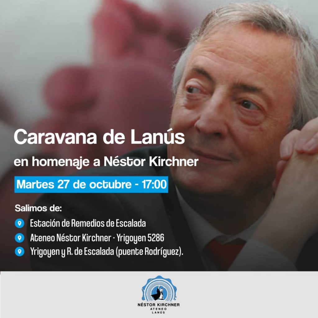 El Ateneo Néstor Kirchner de Lanús -que nuclea a las organizaciones kirchneristas del distrito- convocó a una movilización para conmemorar los diez años del fallecimiento del ex presidente de la Nación. Se trata de una caravana que arrancará esta tarde a las 17 desde tres puntos: a) la estación Remedios de Escalada; b) la propia sede del Ateneo Néstor Kirchner, en Hipólito Yrigoyen 5286; c) Yrigoyen y Remedios de Escalada, debajo del puente Rodríguez. Los organizadores convocan a movilizar con automóviles, motos, bicicletas y otros medios de transporte, con barbijos y respetando el distanciamiento social.