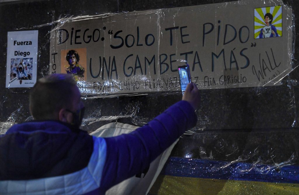 En las puertas de la clínica medio centenar de aficionados con banderas de Boca Juniors, Nápoli, Platense y All Boys, junto a miembros de la denominada «Iglesia maradoniana», esperaban información con una pancarta con la inscripción «Quien ama no olvida, Fuerza D1os».
