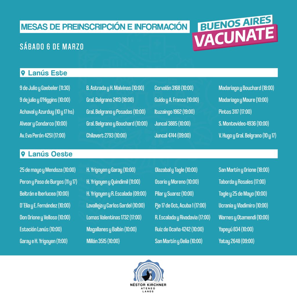 El Ateneo Néstor Kirchner dispondrá mañana un gran despliegue en el distrito, con vistas a asesorar a los interesados en vacunarse contra el Covid-19, en el marco de la enorme campaña dispuesta por la provincia de Buenos Aires. La idea es ayudar con la inscripción online a quienes tengan dificultades para hacerlo, así como asesorar a quienes tengan dudas con los efectos de la vacuna, o necesiten saber si pueden o no vacunarse.