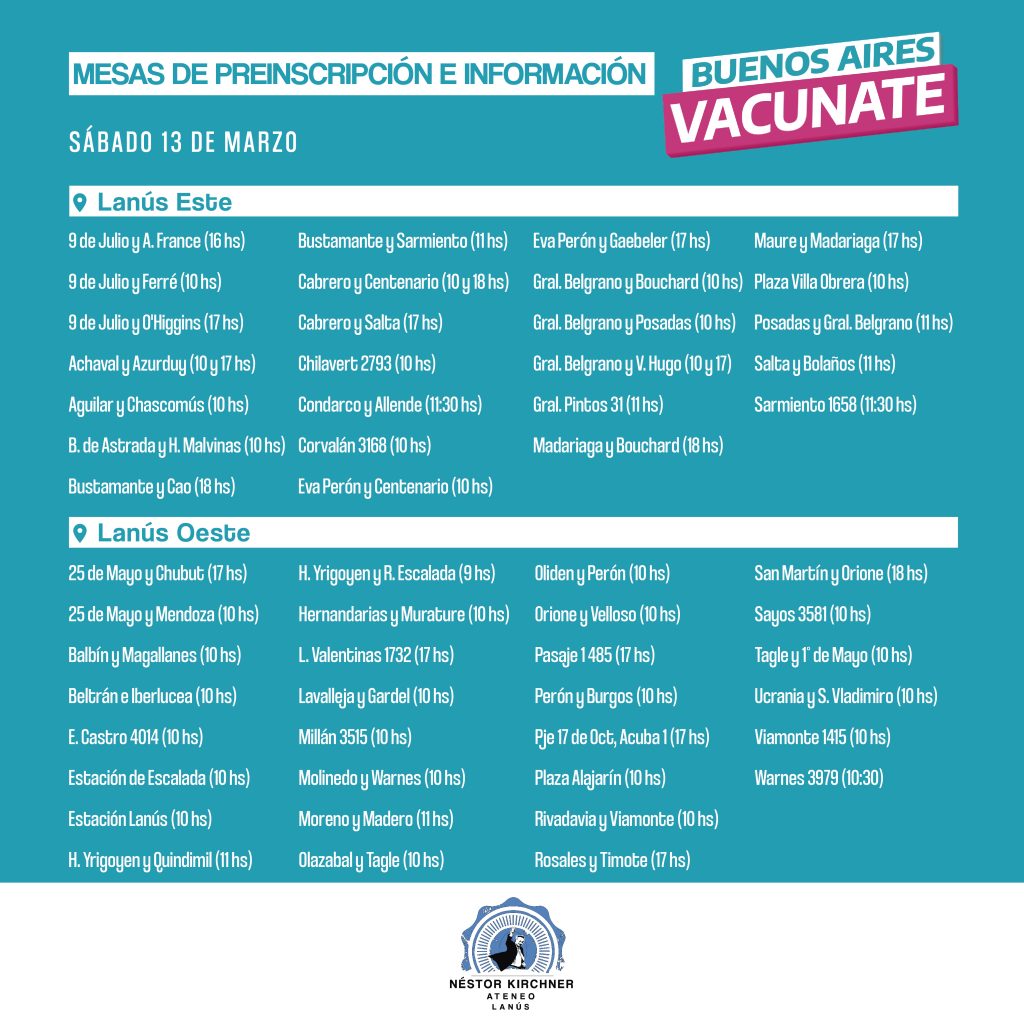 El Ateneo Néstor Kirchner dispondrá durante el día de hoy un gran despliegue en el distrito, con vistas a asesorar a los interesados en vacunarse contra el Covid-19, en el marco de la enorme campaña dispuesta por la provincia de Buenos Aires. La intencion es ayudar con la inscripción online a quienes tengan dificultades para hacerlo, así como asesorar a quienes tengan dudas con los efectos de la vacuna, o necesiten saber si pueden o no vacunarse.