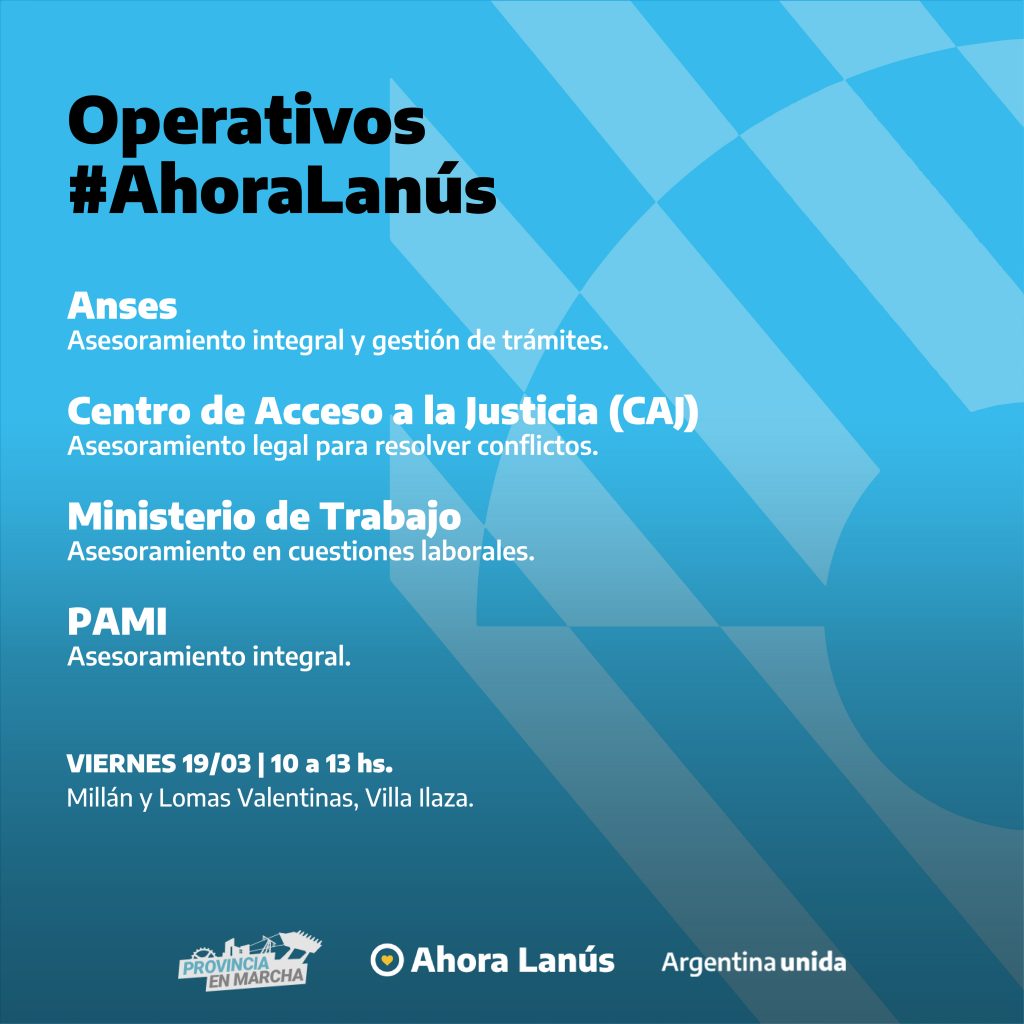 Este viernes 19 de marzo, a partir de las 10:00, y hasta las 13:00, se llevará a cabo un nuevo operativo «Ahora Lanús». La jornada tendrá lugar en la esquina de las calles Millán y Lomas Valentinas, Villa Ilaza.