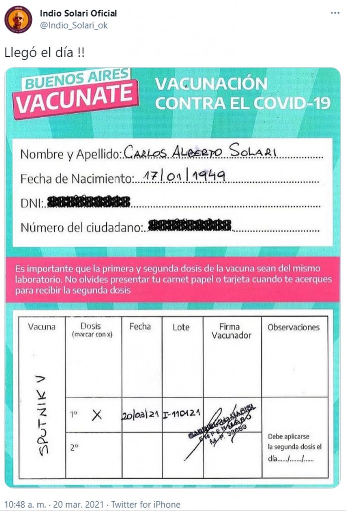 En una entrevista radial, Carlos «Indio» Solari había dicho que «desconfiar de la ciencia rusa es realmente un atrevimiento. ¿Alguien preguntó alguna vez de dónde venían otras vacunas que nos pusimos?». Aquella declaración se había dado en el marco de una feroz campaña opositora contra la vacuna, que rápidamente cayó en el vacío por la alta efectividad que demostró.