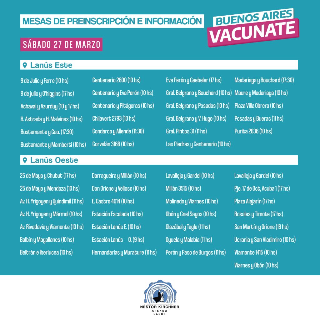 El Ateneo Néstor Kirchner Lanús dispondrá durante el día de hoy un gran despliegue en el distrito, con vistas a asesorar a los interesados en vacunarse contra el Covid-19, en el marco de la enorme campaña dispuesta por la provincia de Buenos Aires. La intención es ayudar con la inscripción online a quienes tengan dificultades para hacerlo, así como asesorar a quienes tengan dudas con los efectos de la vacuna, o necesiten saber si pueden o no vacunarse. Se suspende por lluvia.