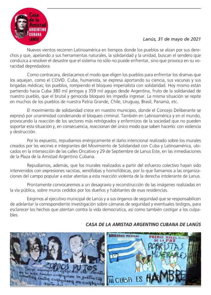 La Casa exige además al ejecutivo municipal que investigue y esclarezca los hechos. En el mismo sentido se expresó la CTA de los Trabajadores de Lanús. «Esas pintadas se volverán a hacer una y otra vez, con la misma convicción que continuamos reclamando el fin del bloqueo a Cuba», destacan.
