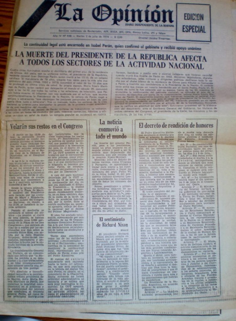 «El general Perón, figura central de la política argentina en los últimos treinta años, murió ayer a las 13:15. En la conciencia de millones de hombres y mujeres, la noticia tardará en volverse tolerable. Más allá del fragor de la lucha política que lo envolvió, la Argentina llora a un líder excepcional».