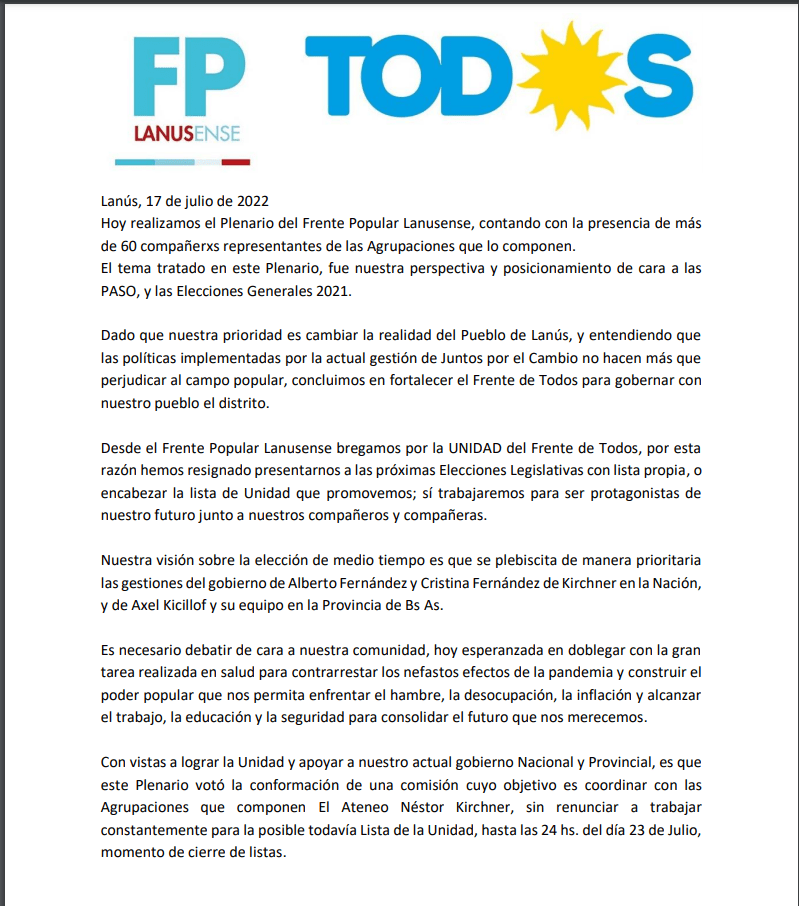 Víctor De Gennaro declinó su candidatura a encabezar una lista en las próximas PASO del Frente de Todos. El Frente Popular Lanusense, la organizacion que comanda el sindicalista, realizó ayer un plenario en el cual decidió no presentar lista propia ni autopostularse para encabezar una lista de unidad en las PASO. Al mismo tiempo, el Plenario decidió coordinar con «las agrupaciones que componen El Ateneo Néstor Kirchner».Como es de público conocimiento, el Ateneo (la representación oficial del kirchnerismo en Lanús) impulsa la candidatura de Julián Álvarez.
