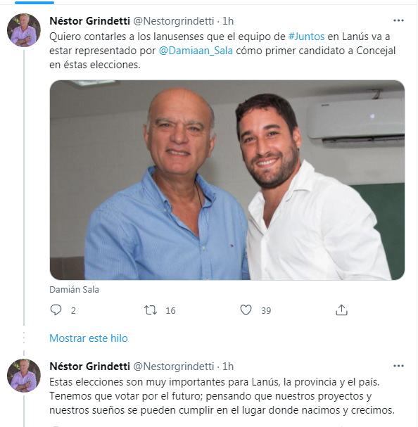 «Quiero contarles a los lanusenses que el equipo de Juntos en Lanús va a estar representado por Damián Sala en éstas elecciones cómo primer candidato a Concejal. Damián es uno de los funcionarios jóvenes que me acompaña desde hace mucho tiempo. Confío en él y en el trabajo que realiza cada día. Conozco su honestidad, sus valores, su capacidad de laburo y sus ganas,» sostuvo Grindetti.