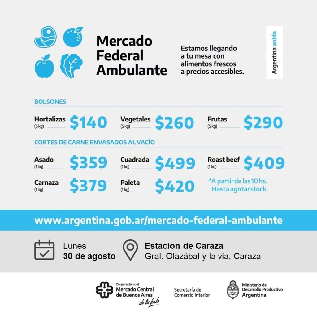 Mañana, del Mercado Central directamente a Lanús. Lleva el Mercado Federal Ambulante a Lanús. La cita es el lunes 30 de agosto en la estación de Caraza (Olazábal y la vía) y los precios prometidos son muy tentadores: cinco kilos de hortalizas a 140 pesos o un kilo de asado a 359 pesos dan cuenta de una buena oprtunidad para el bolsillo.