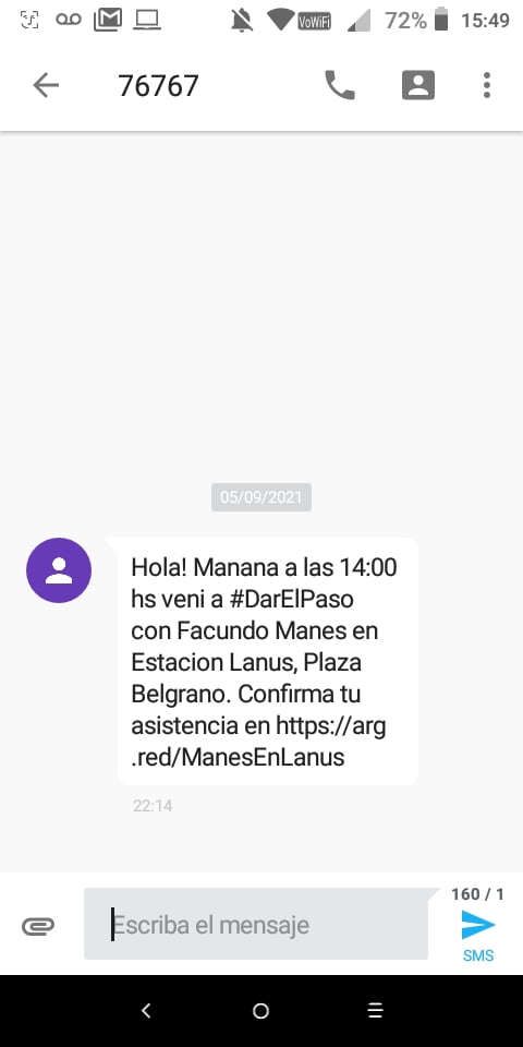 El candidato de la UCR en la provincia de Buenos Aires, Facundo Manes, (que participa en las PASO de Juntos, donde enfrenta a Mauricio Macri) realizó ayer un acto en la Plaza Belgrano, en plena estación de Lanús. Lo acompañó su escudero local, Emiliano Bursese. Hasta ahí, una noticia de lo más normal, en época de campaña electoral. Lo notable, sin embargo, no es el acto en sí mismo, sino el modo en que lo comunicó. Miles de ciudadanos lanusenses recibieron un sms del 76767 invitándolos al acto. La pregunta inquietante es: ¿De dónde sacaron esos números de teléfono? Y 2) ¿Cómo saben que esos ciudadanos viven en Lanús? ¿Quién les proporcionó a los radicales una base de datos con celulares de personas del distrito? ¿Cuántas otras cosas saben sobre vos? Turbio. Como mínimo. Adjuntamos captura de una de las misteriosas «invitaciones».