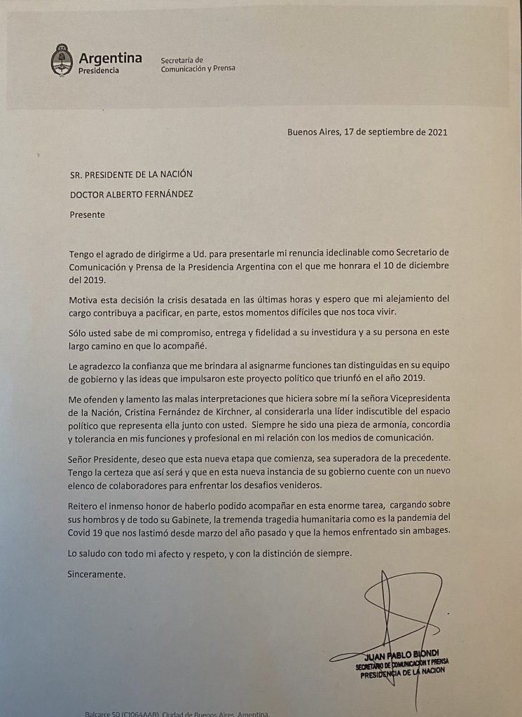 «Tengo el agrado de dirigirme a usted para presentarle mi renuncia indeclinable como secretario de Comunicación y Prensa de la Presidencia Argentina con el que me honrara el 10 de diciembre de 2019», escribió Biondi en el primer párrafo de la carta al jefe de Estado.