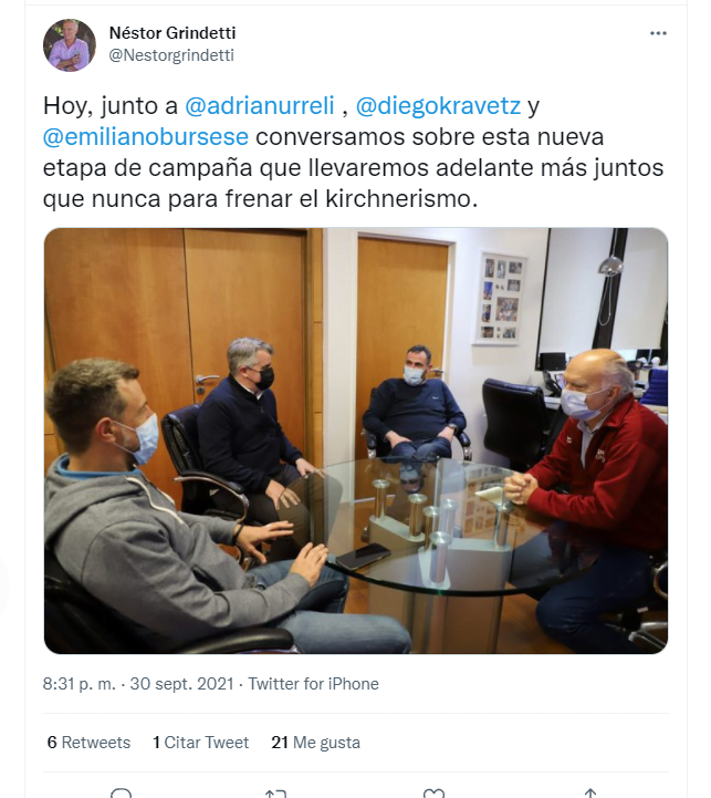 Néstor Grindetti es el intendente de Lanús y es, a la vez, el jefe de campaña de Juntos (ex Cambiemos, ex Juntos por el Cambio) en la provincia de Buenos Aires. AJá. Es lógico que, como se estile en estos casos, procure la foto de la unidad, para mostrar que el candidato derrotado acompañará al vencedor, que no hay heridos, que tirarán todos juntos del mismo carro, etc. Por eso llamó a Emiliano Bursese, quien encabezó la lista de la UCR, y se sacaron «la» foto. Acompañaron el jefe de gabinete de Lanús, Diego Kravetz, y el diputado provincial Adrián Urreli. Al que no se ve en la foto es a Damián Sala. ¿Se olvidaron de avisarle? ¿Se olvidaron de que existe? ¿Invitaron a su rival derrotado y no a él? Es curioso: en la esquina de Hipólito Yrigoyen y Piñeyro hay un cartel gigante, más que gigante, pluscuamgigante de Juntos. Allí aparecen Diego Santilli, Néstor Grindetti, Diego Kravetz y Adrián Urreli. ¿Y Sala? No, ahí tampoco está. Parece que ahí también se lo olvidaron. Extraño, ¿verdad?