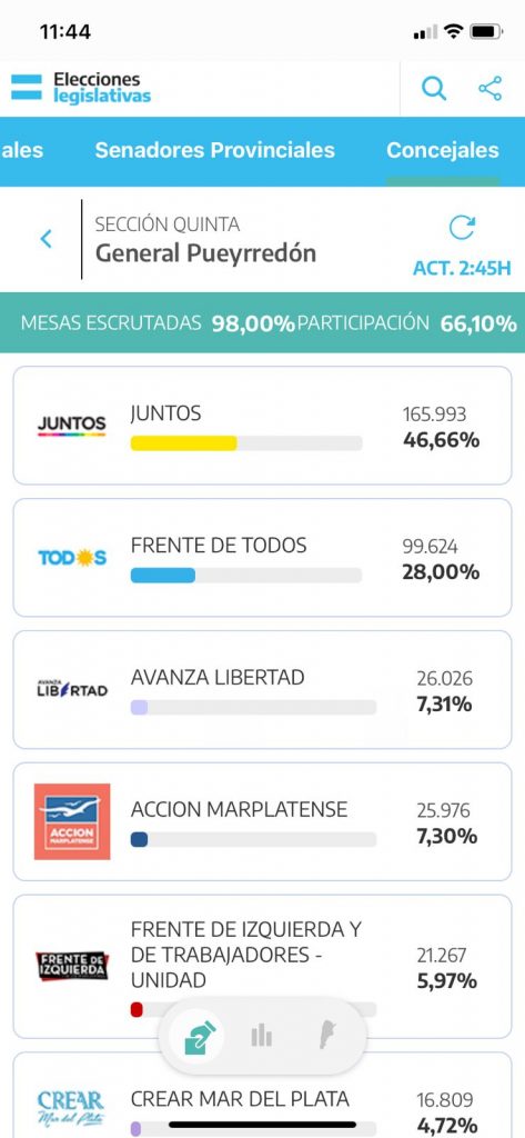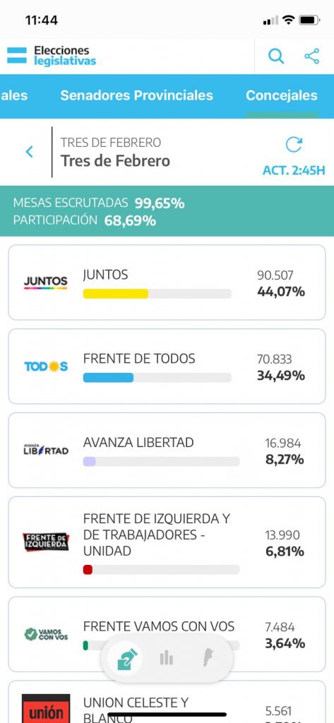 Ocho décimas separaron a la lista de Grindetti de la que encabezó Julián Álvarez. Ocho décimas, que podrían ser menos cuando se haga el escrutinio definitivo en La Plata. Contra todos los pronósticos macristas, el Frente de Todos logró conservar los votos obtenidos a través de sus tres listas de las PASO y mostró a Álvarez, Balladares y Galdurralde unidos no sólo durante la campaña electoral, sino también luego de ésta. Por eso, pese a los pronósticos agoreros de dispersión del voto que surgieron desde las usinas macristas, tuvo 7 mil votos más que en las PASO. 106000 ahora versus 99000 de septiembre.