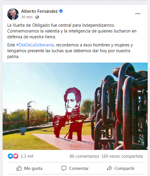El presidente de la Nación, Alberto Fernández, señaló que «La Vuelta de Obligado fue central para independizarnos. Conmemoramos la valentía y la inteligencia de quienes lucharon en defensa de nuestra tierra.Este #DíaDeLaSoberanía, recordemos a esos hombres y mujeres y tengamos presente las luchas que debemos dar hoy por nuestra patria».