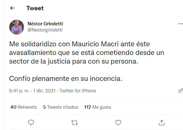El intendente de Lanús y candidato a vicepresidente de Independiente, Néstor Grindetti, defendió con un confuso tuit a su amigo, el ex presidente Mauricio Macri. «Me solidaridizo (sic) con Mauricio Macri ante éste (sic) avasallamiento que se está cometiendo desde un sector de la justicia para con su persona. Confío plenamente en su inocencia», señaló Grindetti, ante el procesamiento, embargo por 100 millones de pesos y prohibición de salida del país dictados por el juez Mario Bava.