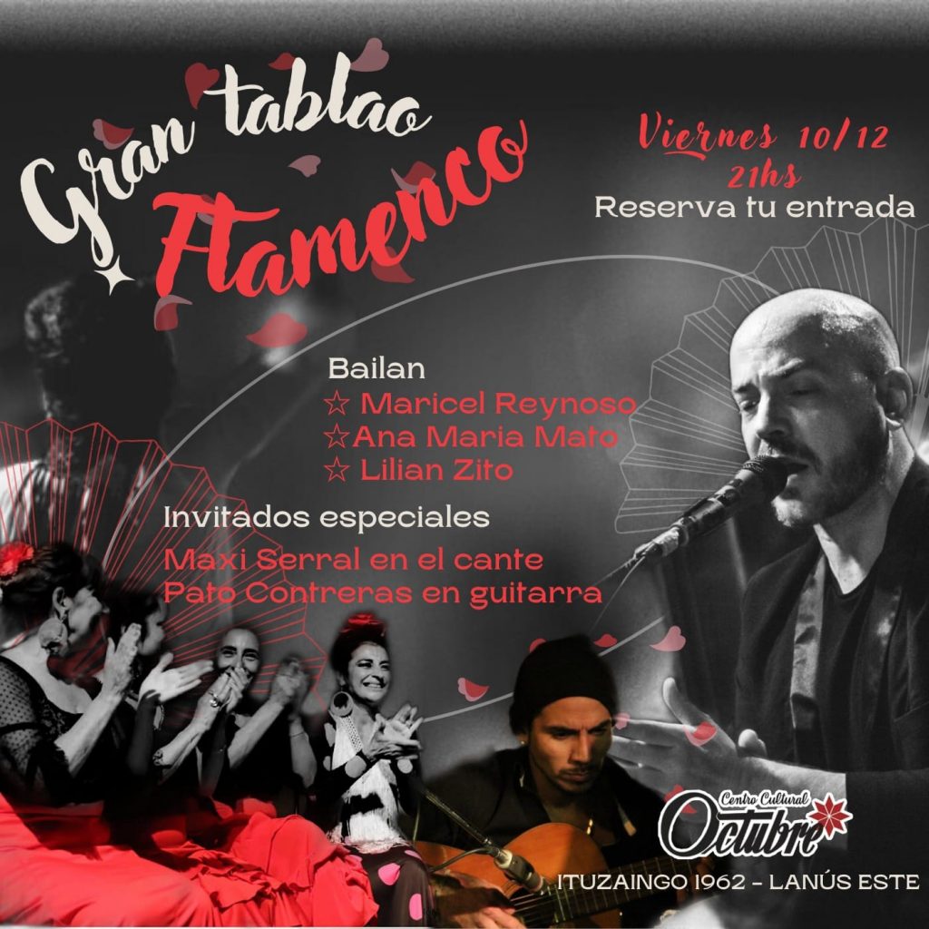 Gran Tablao Flamenco. Bailan Maricel Reynoso, Ana María Mato y Lilian Zito. Invitados especiales, Maxi Serral en el Cante y Pato Contreras en guitarra. En Centro Cultural Octubre. Ituzaingó 1962. A las 21.