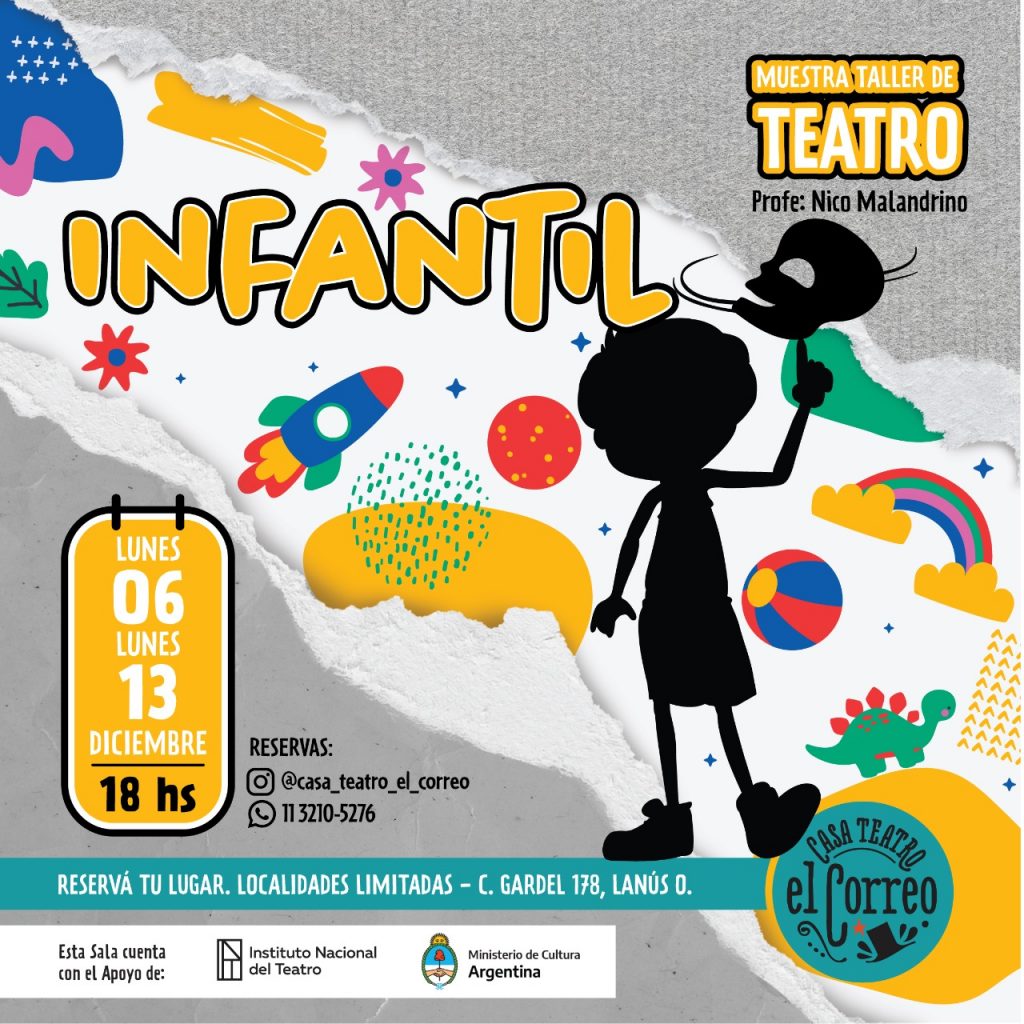 Muestra taller de teatro infantil. Profe: Nico Malandrino. En Casa Teatro El Correo. Carlos Gardel 178. A las 18.