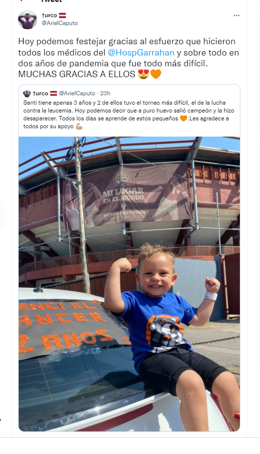 «Santi tiene apenas 3 años y 2 de ellos tuvo el torneo más difícil, el de la lucha contra la leucemia. Hoy podemos decir que a puro huevo salió campeón y la hizo desaparecer. Todos los días se aprende de estos pequeños», escribe Ariel Caputo en Twitter. Luego le agradece por su esfuerzo a los médicos del hospital Garrahan. Santi es el sobrino de Ariel y es, como su tío, hincha de Lanús. El pequeño campeón celebró su logro en la Fortaleza, a bordo de un auto que llevaba escrita una leyenda hermosa: «Vencí al cáncer». Aguante Santi. Vamos Grana.