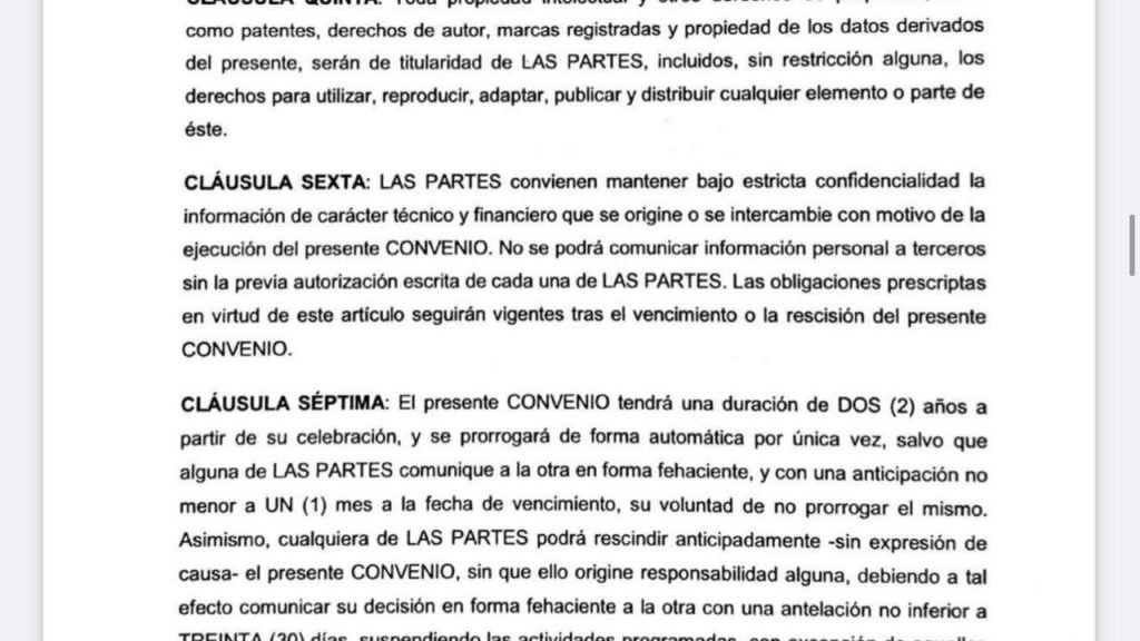 Sin ambargo, lo más misterioso del convenio que los concejales macristas aprobaron hoy es la llamada Cláusula Sexta, que indica que «Las partes convienen mantener bajo estricta confidencialidad la información de carácter técnico y financiero que se origine o se intercambie con motivo de la ejecución del presente convenio» (sic). En otras palabras, que tanto la Ciudad de Buenos Aires como el Municipio de Lanús se comprometen a guardar silencio respecto del dinero que gasten, así como de en qué la gasten. Si no lo podés creer, leélo acá abajo.