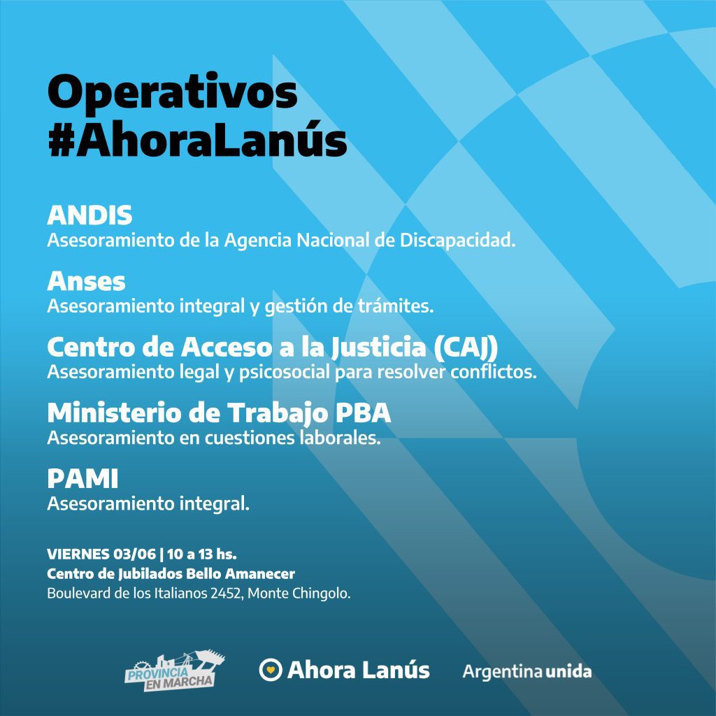 Este viernes de 10:00 a 13:00 se llevará a cabo un nuevo operativo Ahora Lanús, esta vez en el Centro de Jubilados Bello Amanecer, ubicado en Boulevard de los Italianos 2452, Monte Chingolo.