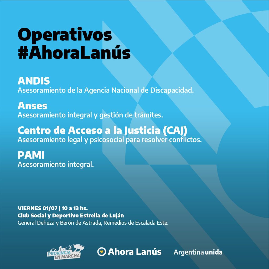 Este viernes a partir de las 10 de la mañana, y hasta las 13:00, se llevará a cabo, como todas las semanas, un nuevo operativo Ahora Lanús. La jornada tendrá lugar en el comedor en el Club Social y Deportivo Estrella de Luján, ubicado en General Deheza y Berón de Astrada, Remedios de Escalada Este.