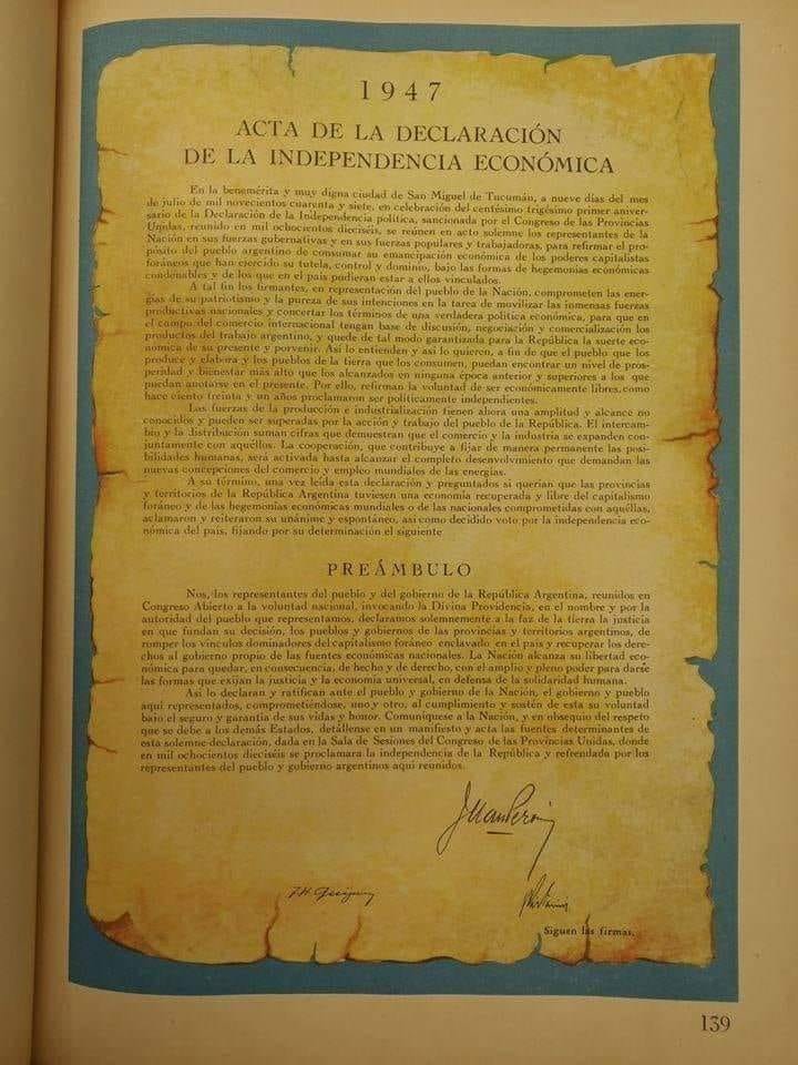 Unidas, reunido en mil ochocientos dieciséis, se reúnen en acto solemne los representantes de la Nación en sus fuerzas gubernativas y en sus fuerzas populares y trabajadoras para reafirmar el propósito del pueblo argentino de consumar su emancipación económica de los poderes capitalistas foráneos que han ejercido su tutela, control y dominio, bajo las formas de hegemonías económicas condenables y de los que en el país pudieran estar a ellos vinculados.