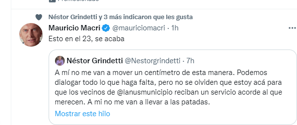 En el día en que Lanús fue noticia por la represión a los trabajadores municipales -a los que, dicho sea de paso, se les viene negando una discusión paritaria y se les descontaron los días de paro- Néstor Grindetti recibió el apoyo de su jefe político y mentor: el ex presidente Mauricio Macri. El hombre que hiciera surgir a Grindetti como empleado del grupo SOCMA y como su ministro de Economía en la ciudad de Buenos Aires, señaló «Esto en el 23, se acaba». Curiosamente, el tuit de Grindetti decía «no se olviden que estoy acá» cuando el jefe comunal estaba… ¡en Tandil!