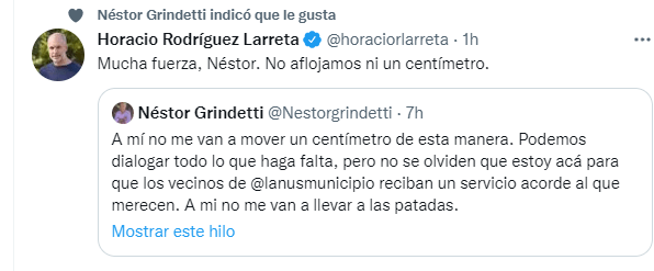 Otro que se solidarizó con Grindetti (no podía ser menos que Macri) fue el jefe de Gobierno de la ciudad de Buenos Aires, Horacio Rodríguez Larreta: «Mucha fuerza», le pidió, cuando fue eso mismo lo que desplegó la policía sobre los trabajadores.