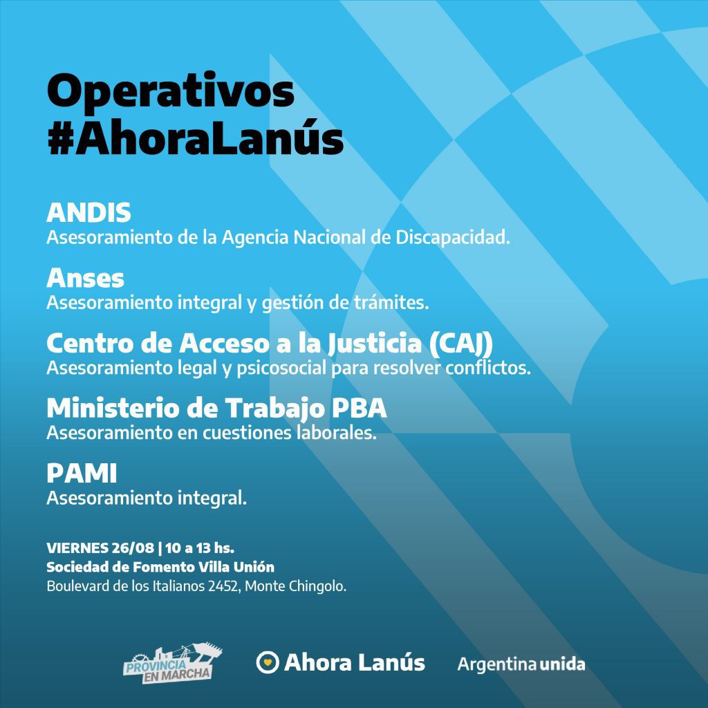 Este viernes de 10 a 13 horas, se llevará a cabo un nuevo operativo Ahora Lanús. La jornada tendrá lugar en la Sociedad de Fomento Villa Unión, ubicada en Boulevard de los Italianos 2452, Monte Chingolo.