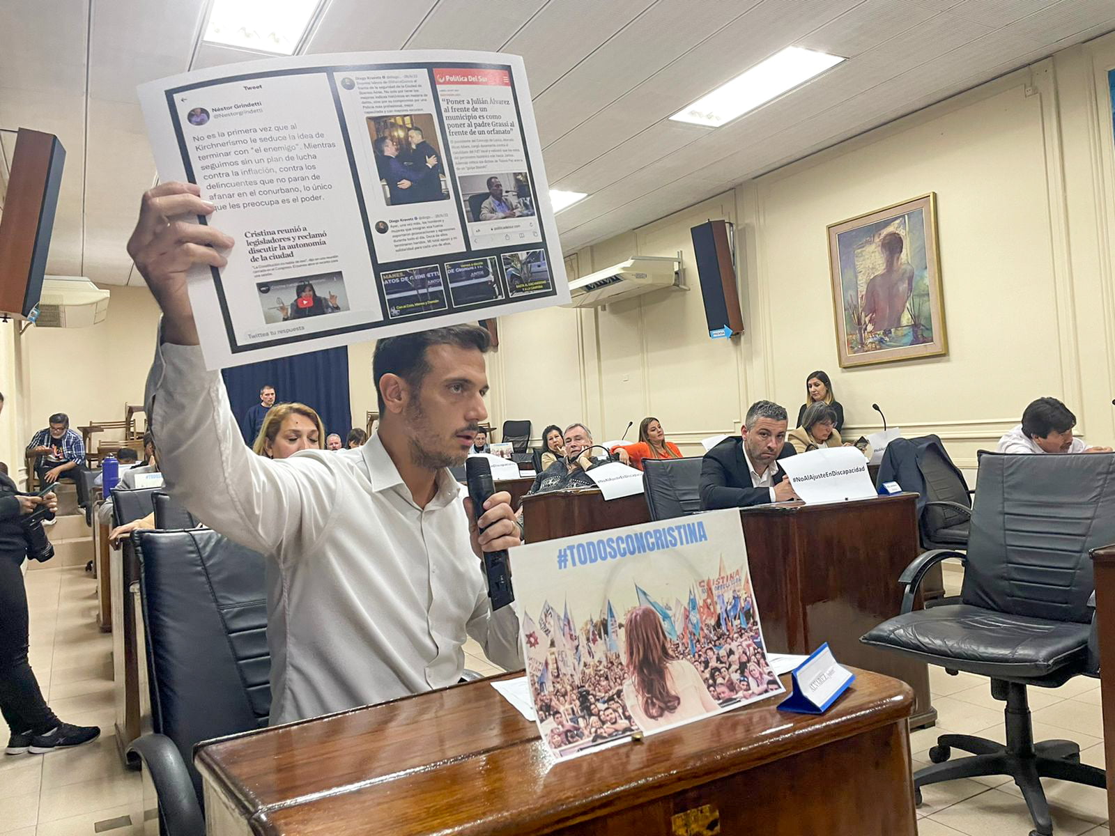 Julián Álvarez fue quien representó la postura del bloque kirchnerista en el Concejo y recordó que Rivas Miera, por toda opinión sobre el atentado dijo «No les creo nada» . El funcionario además retuiteó el artículo que publicó La Unión de Lanús al respecto. El proyecto menciona que luego «cobardemente» borró el tuit. «¿No van a repudiar a Rivas Miera?», preguntó Julián Álvarez. Por increíble que parezca, ningún macrista lo hizo. Concejales de otros sectores peronistas también hicieron uso de la palabra durante la sesión. Agustín Balladares recordó otros episodios históricos de violencia antiperonista (Revolución «Fusiladora», proscripción, dictadura).