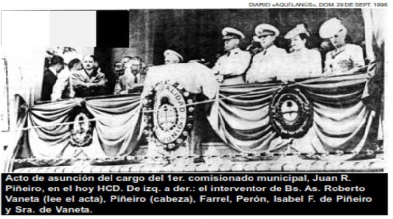 El 1º de enero de 1945 asumió nuestro primer Intendente con el cargo de Comisionado: Juan Ramón Piñeiro. En la ceremonia de asunción realizada en la casona donde hoy funciona el Honorable Concejo Deliberante de Lanús, en la calle 9 de Julio frente al Club Atlético Lanús, estuvieron presentes Farrell, Perón y el nuevo Interventor de la provincia de Buenos Aires que reemplazó a Sanguinetti, Roberto M. Vanetta. Una multitud acompañó tan importante acontecimiento.