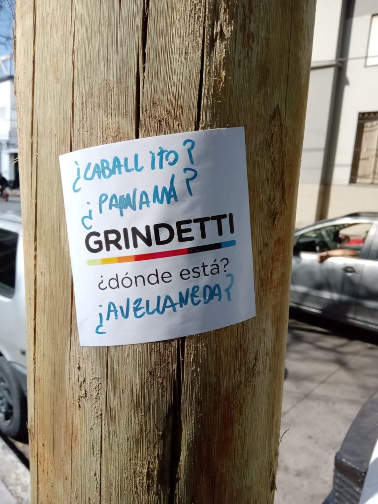Es una variación del mismo sticker que ayer se vio en el barrio de Villa Obrera y que circula desde que los vecinos y vecinas se manifestaron para protestar contra Edesur y contra la increíble indiferencia de Grindetti ante los cortes de luz, pero que terminó de ganar las calles ante la inédita licencia del jefe comunal para presidir un club de fútbol: un gesto inédito en la historia de la humanidad.