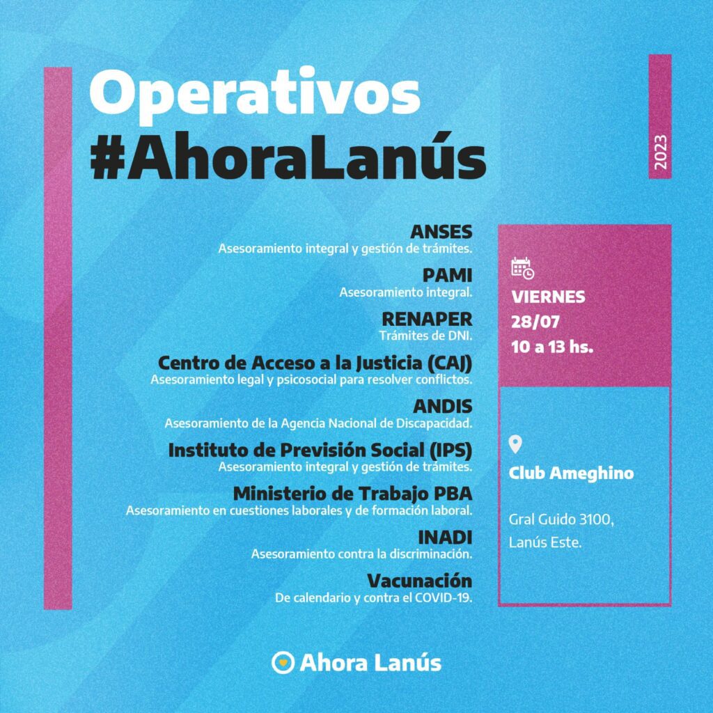 El Operativo Ahora Lanús llega ahora al barrio de Villa Obrera. El jueves 27 y el viernes 28 de julio, en el horario de 9 a 15, estará presente en el Club Ameghino, cuya dirección es Guido 3109 (esquina Oyuela) . El jueves 27 estará dedicado exclusivamente a trámites del RENAPER: se otorgarán 70 turnos por orden de llegada. El viernes también se podrán realizar trámites del RENAPER (DNI y pasaporte) , pero además se podrán realizar trámites de PAMI, Anses, IPS, AnDis, ministerio de trabajo y aplicarse vacunas, tanto de calendario como contra el COVID 19. El grueso de los trámites del viernes se podrán realizar de 10 a 13. Para los trámites de Renaper, el horario se extiende hasta las 15.