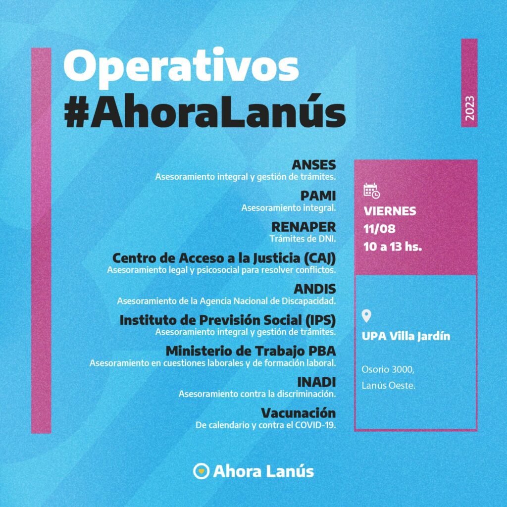 Se viene un nuevo Operativo Ahora Lanús, en el cual los vecinos y vecinas podrán acceder a trámites gratuitos de ANSES, PAMI, Renaper, y otros organismos provinciales y nacionales, sin la necesidad de acercarse hacia la sede de estas dependencias del Estado.