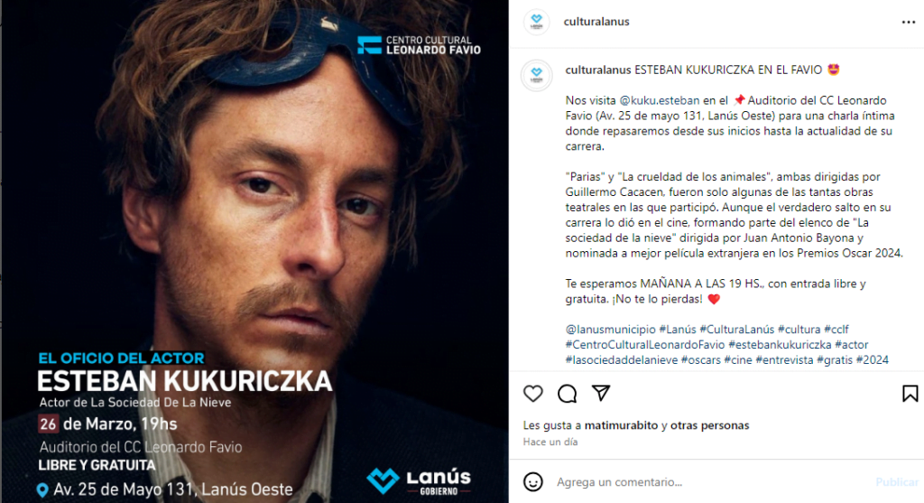 La entrada al evento es libre y gratuita, de esta manera los lanusenses podrán escuchar a un participante del elenco de «La sociedad de la nieve» dirigida por Juan Antonio Bayona y nominada a mejor película extranjera en los Premios Oscar 2024.