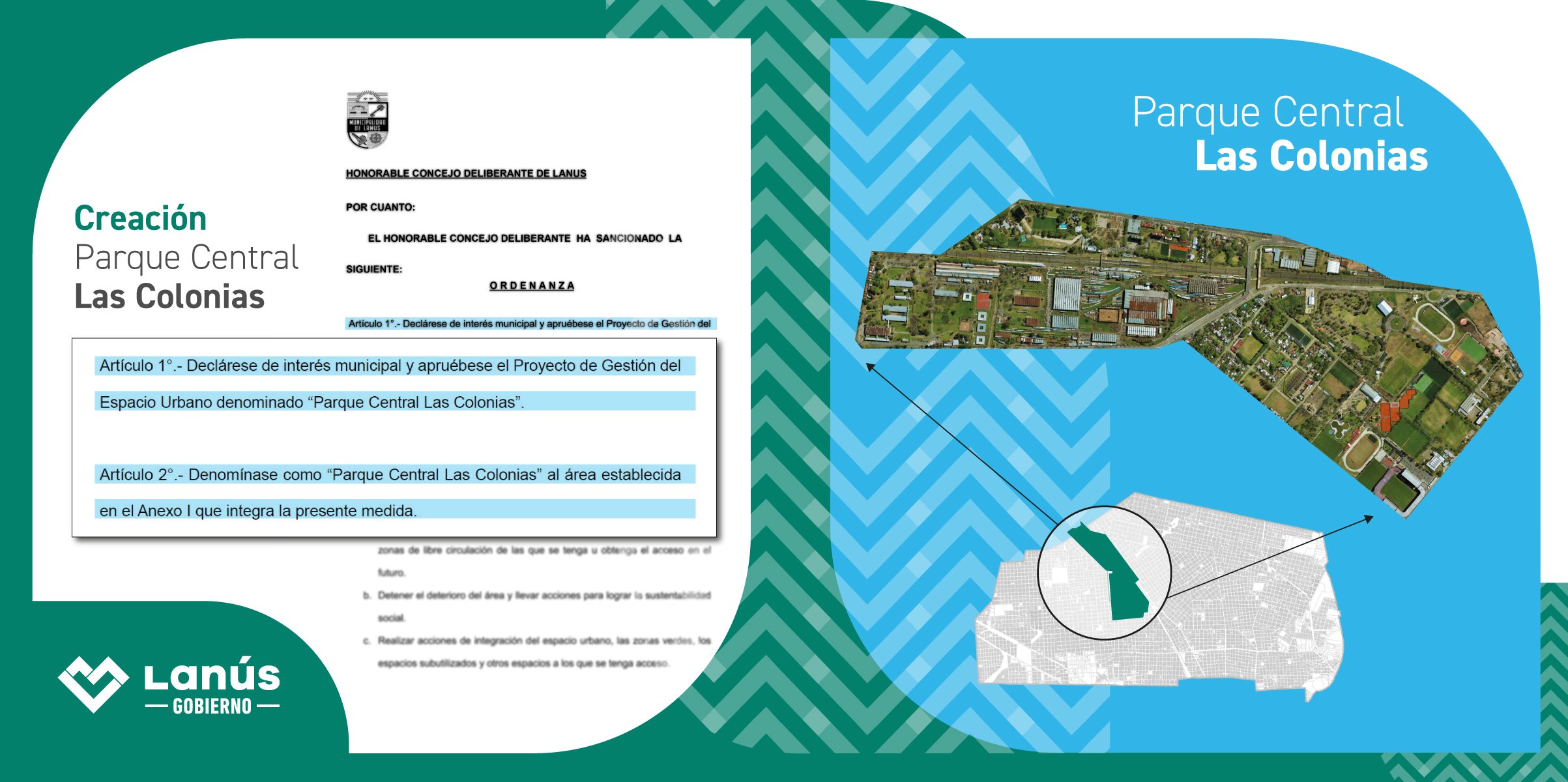 Lanús Gobierno presentó el proyecto para el desarrollo del “Parque Central Las Colonias», que fue aprobado por el Honorable Concejo Deliberante de Lanús bajo la ordenanza 89/24. El mismo, situado dentro de las localidades de Remedios de Escalada, Lanús Oeste y Lanús Este, funcionará como un gran pulmón verde que podrán disfrutar los vecinos y vecinas.